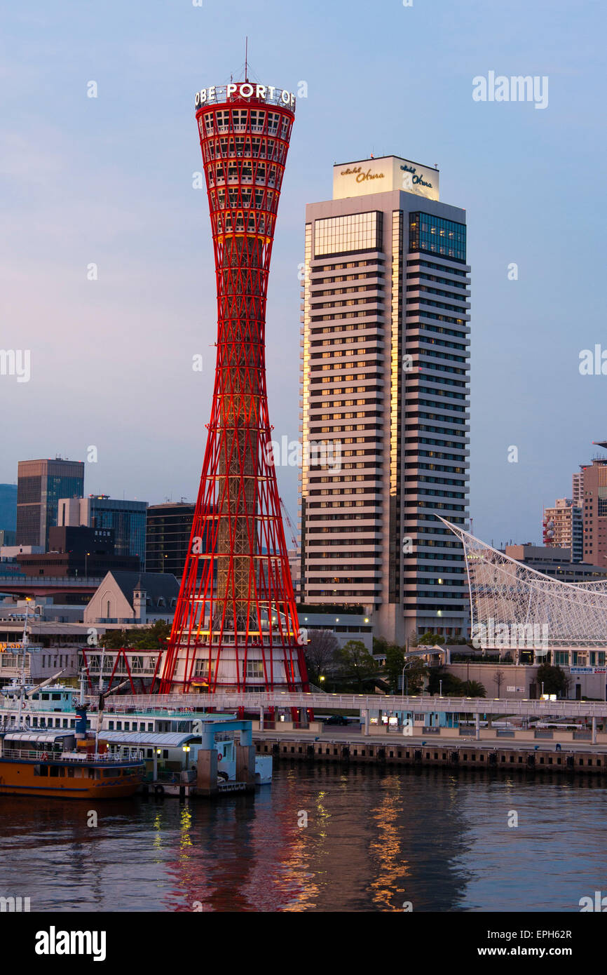 Kobe Famous Waterfront View Of The Red Kobe Port Tower The Okura Hotel High Rise And The White Metal Frame Work Structure Of The Maritime Museum Stock Photo Alamy